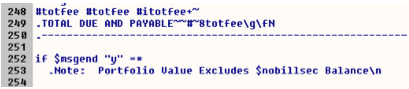 6. OK. At this point, we’ve prevented the $nobill security from being accumulated into the portfolio market value, and we’ve stored the full name of the $nobill security. Let’s add a message to the bottom of the billing statement to tell the client that we’ve excluded the holding. Add lines 252 and 253 as shown below.