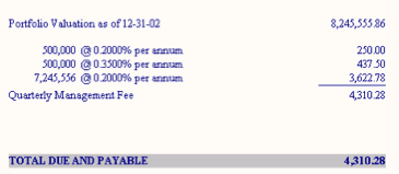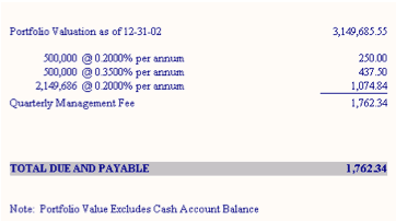All done. Save your rep file and run it. Your new fee statement report will exclude the $nobill security from the Portfolio Valuation and print an appropriate message at the bottom