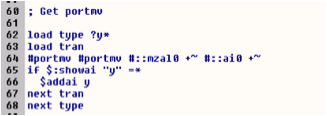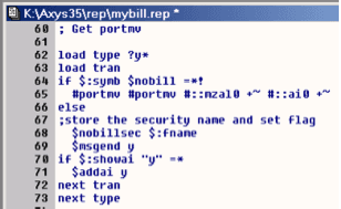 5. Replace the old line 64 (above) with the new lines 64 through 69 below. What we are doing in this section of code is telling Axys: If the symbol is not the same as what we’ve stored in $nobill, then accumulate the market value as usual. Otherwise (ie, if the symbol is the same as what we’ve stored in $nobill) store the name of the security in a label $nobillsec.