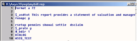 2. Make a copy of bill.rep. I saved my copy as mybill.rep. Now we have a .rep file we can edit without affecting the original billing statement report. This is important – never modify the original Axys reports. Make modifications only to your copies.